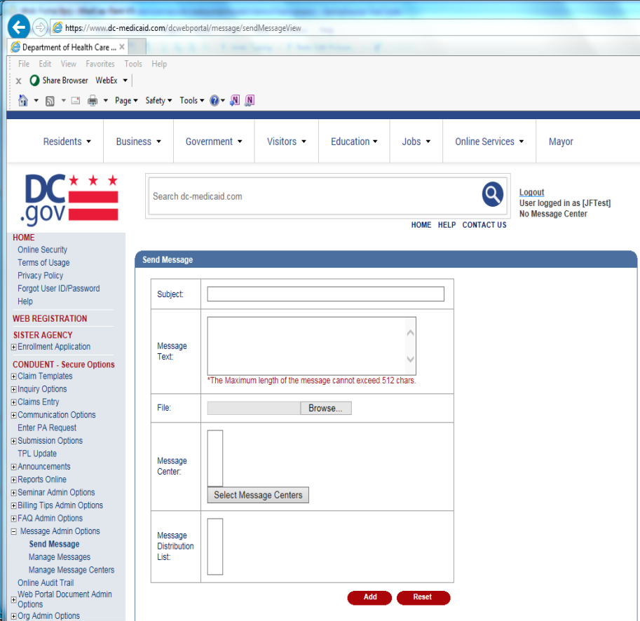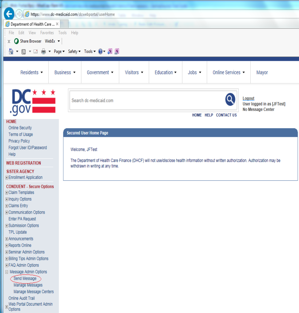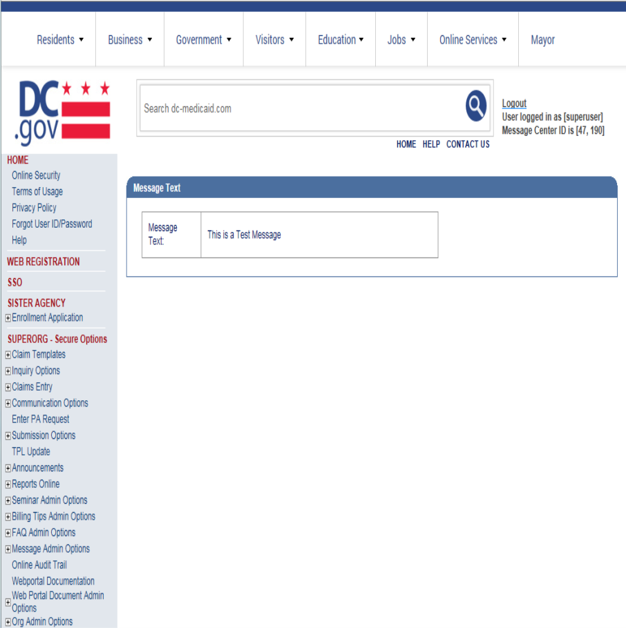 Overview - The Message Center function allows a user to send, view, and delete messages. User may be providers or Conduent and DHCF staff members. Providers may use the message center to view communications from DHCF and Conduent and to send messages to DHCF and Conduent. DHCF and Conduent staff members may use the message center to communicate with providers and each other.
