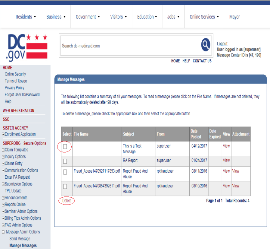 - The web portal displays the Manage Messages web page. To delete a message, the user should click the check box under Select next to the message to delete. Then, the user should click Delete to remove the message.