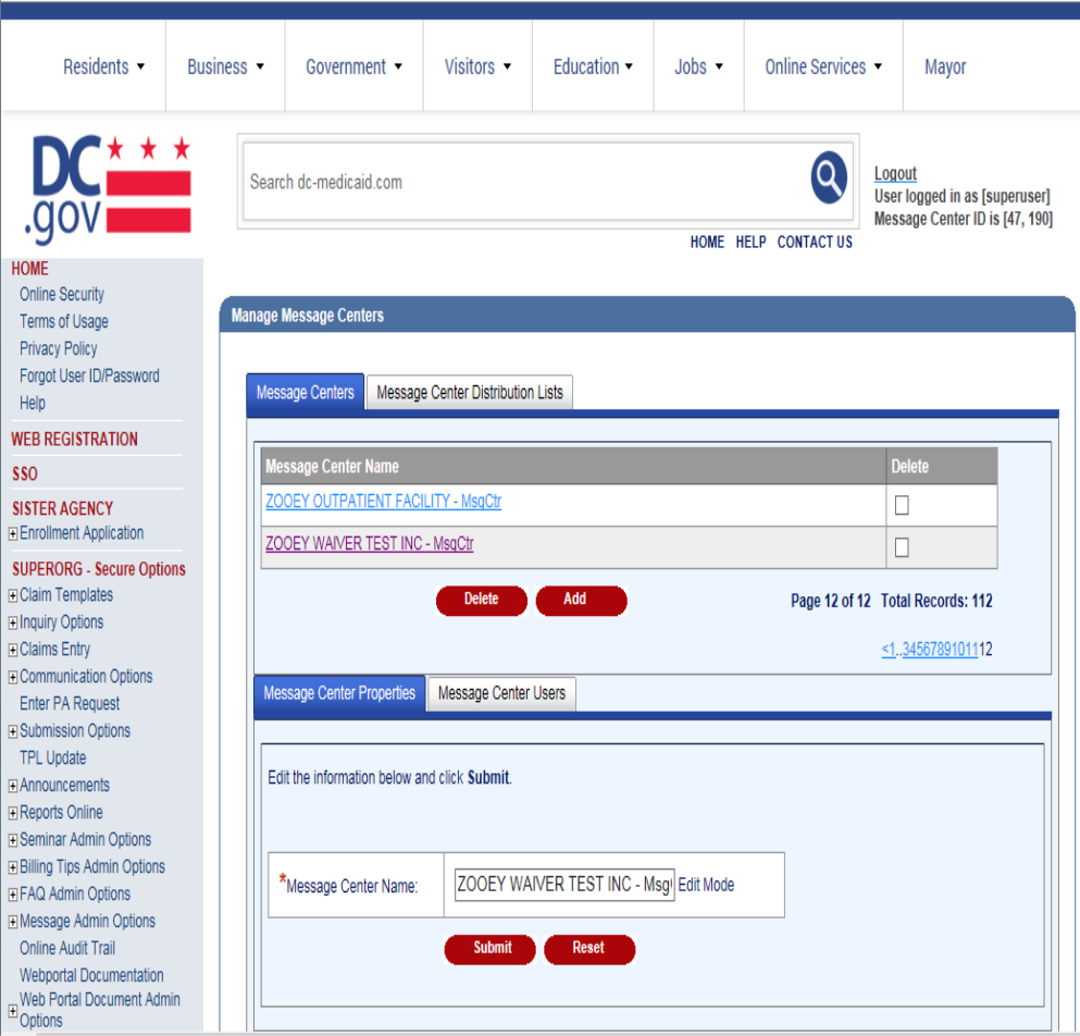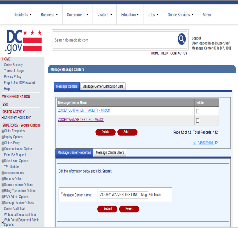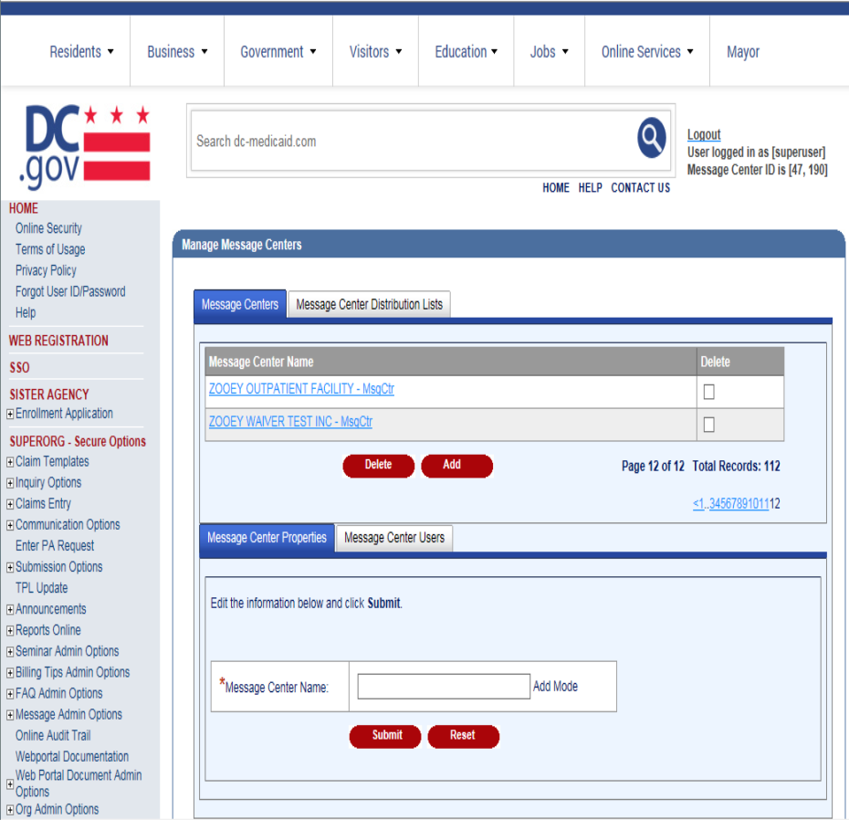 - The Manage Message Centers web page will display. The user may add a new message center by entering the name in the Message Center Name field and clicking Submit.