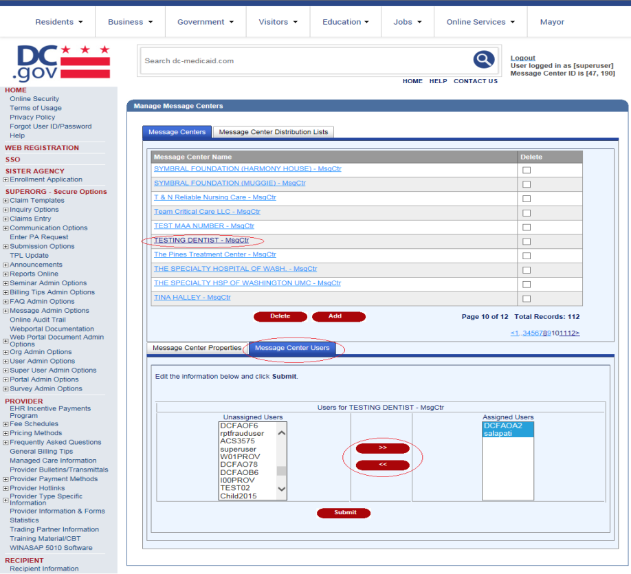 - The user should click Message Center Users to display the list of unassigned and assigned users.