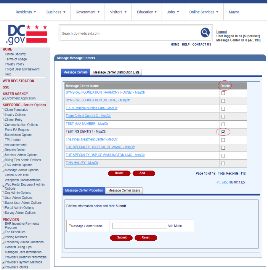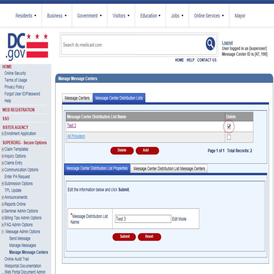 Manage Message Centers (Delete Distribution List): Web Page Image