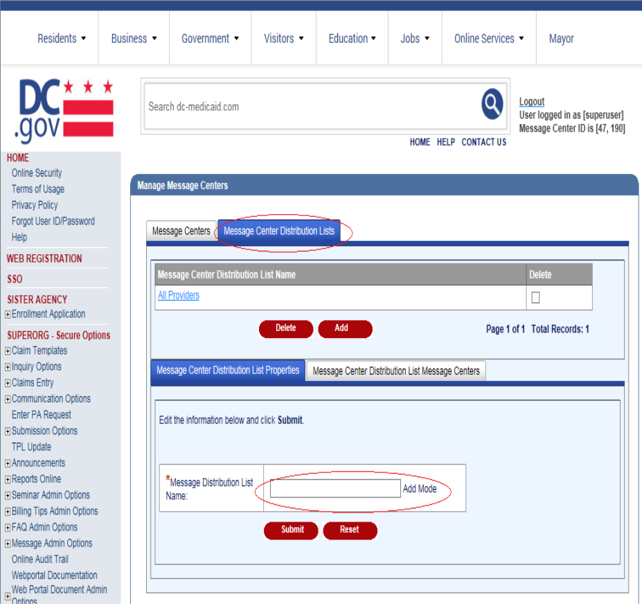 - The user should enter the name of the new message distribution list in the Message Distribution List Name field and click Submit.