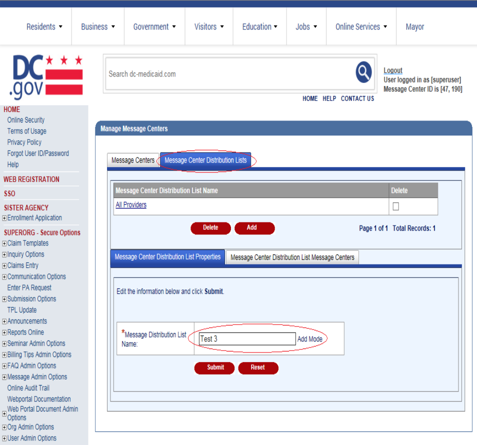 - To edit the name of an existing message distribution list, the user should click on the message distribution list that he/she wishes to update. The message distribution list name will appear in the Message Distribution List Name field under Message Distribution List Properties.