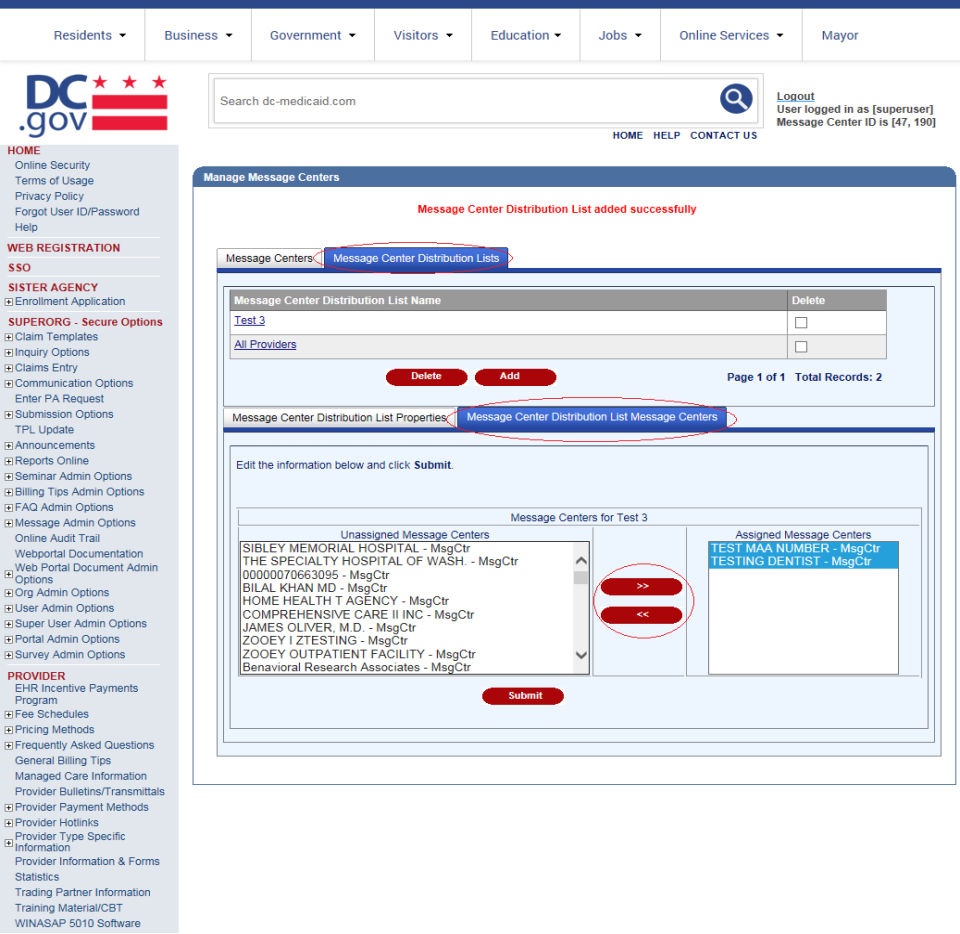 - The user should use the arrows to add and/or remove message centers from a message distribution list.
