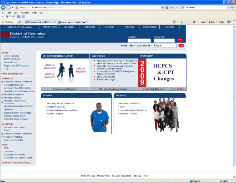 Overview - The DC Web portal provides Medicaid-related content to providers and the interested public. The public pages of the Web portal supply general information such as contact information, frequently asked questions (FAQs), statistics, and other static Web content. Confidential provider- or patient-related data are disclosed only on the portal’s private pages. Private web pages are accessible only by authorized users and may contain protected provider and patient healthcare information.